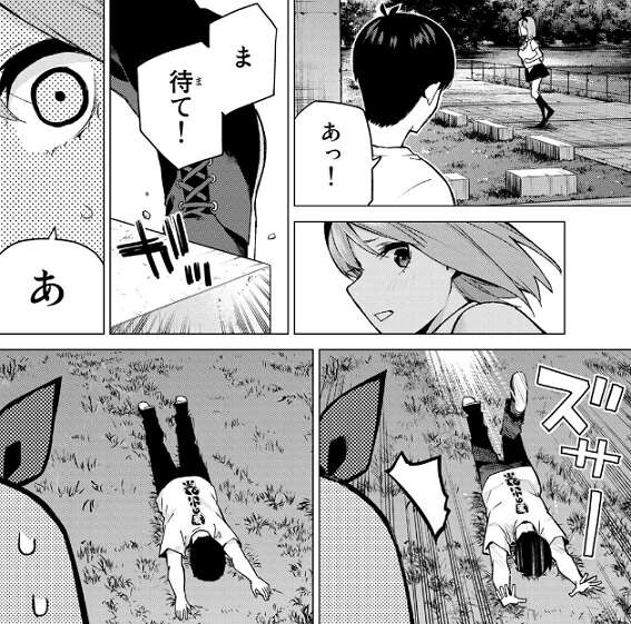 やっと四葉を見つけた風太郎は、四葉に待つように言いながら近寄ろうとしますが、足元のブロックにつまずき盛大にこけてしまいます。