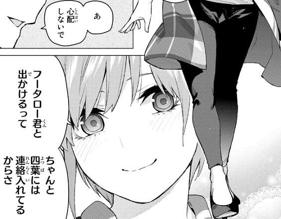 一花が四葉から何も聞いていないようだったので、風太郎は念のため一花に聞いていないか確認します。すると、昨日は久々に父親と一緒に食事だったから風太郎のことはあんま話題に上らなかったと聞かされます。話の流れ上、一花から何があったか質問され仕方なく、風太郎は四葉が俺のことを好きだと言ってくれた事を話します。興味津々で食いついてくる一花は、その後どうなったかさらに質問してきます。すると風太郎は、その後四葉からまだやらなくちゃいけないことがあります、と言われて実は風太郎と四葉はまだ付き合っていないこと、やべー地雷を踏んだかもしれないと不安になっている事を一花に告白します。