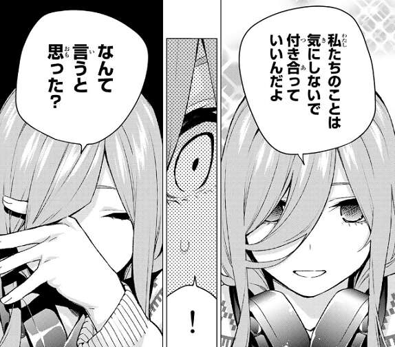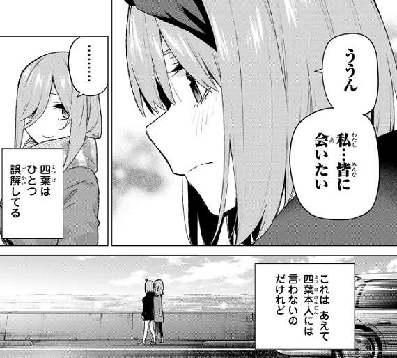 私達のことは気にしないで付き合っていいんだよと三玖が言い四葉は驚きますが、その直後に続けて三玖がなんて言うと思った?と言います。三玖はどうしても感情が荒立ってしまう、それだけ本気だったと言い、私たちのこの感情も受け止めてほしいと四葉に想いを伝えます。
