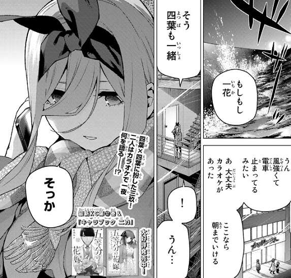 夜の海で会っていた四葉と三玖ですが、風が強くなり電車が止まってしまい、家に帰れなくなってしまいました。四葉と三玖はカラオケに入って朝まで時間を潰すことにし、三玖は一花に電話で連絡をします。