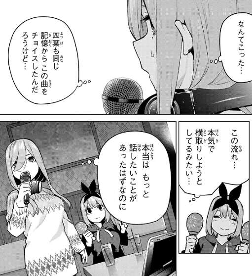 二人とも無言でいると、三玖が急に海での話の続きを始めて、四葉になり変わるってのは冗談だと言います。私は四葉の真似はできても四葉にはなれない、このジュースは私には甘すぎると三玖は四葉に話します。その後せっかくだし歌おうと三玖が言い、四葉も賛成します。二人が偶然にも選んだ歌は、二乃が家でしつこいくらい聴いていた曲、ラブ☆バケーションでした。