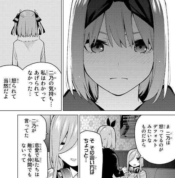 四葉は二乃の気持ちを分かってあげられてなかった…と反省し、怒られて当然だと言います。しかし、二乃は怒ってるのがデフォルトみたいなものだからと三玖は茶化した後、恋愛で私たちは敵でも仲間でもない、と二乃が言っていた事を伝えます。