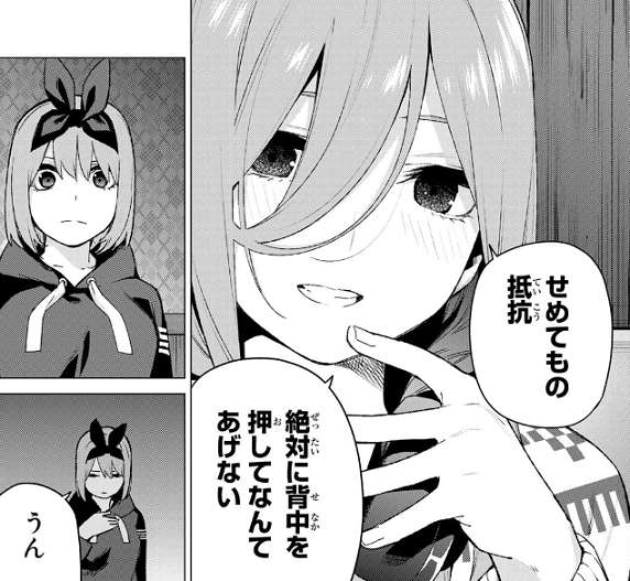 三玖はせめてもの抵抗、絶対に背中を押してなんてあげない、と三玖は笑顔で話しますが、内心は四葉に行き場をなくした私たちの怒りを受け止めて欲しいと三玖は願いします。
