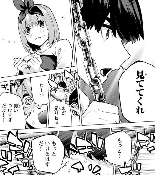 が、勢いをつけ過ぎてボロブランコの鎖が壊れてしまい、風太郎はボロブランコから吹っ飛んでしまいます。地面に倒れた風太郎を見て死んだのでは?と心配する四葉ですが、風太郎は生きていて、デート一つこなすことのできない未熟者の俺だが、お前の横に立って並べる男になれるよう精進すると話し始めます。