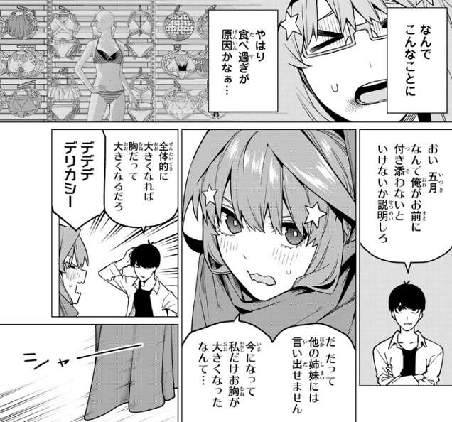 三玖は二乃の胸をもんで、前より大きくなってる…、と言うと、二乃の水着ではないかと言い出します。二乃も風太郎と一緒に水着の試着に来ていたようで、その時の事を思い出します。