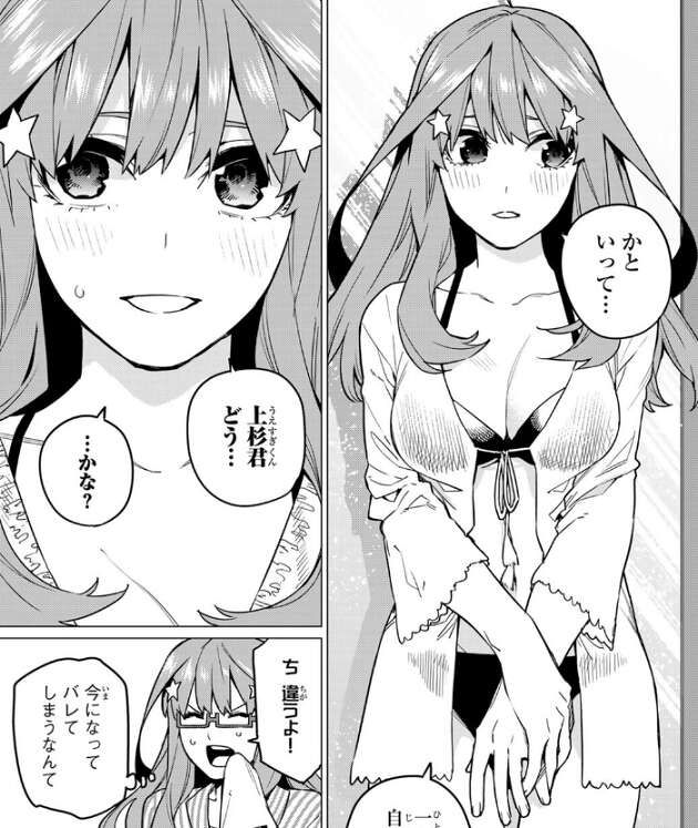 内容は、中野家の実家で一着だけ明らかに他より大きな水着が見つかり、誰の水着か犯人を捜す、といものです。しかし、風太郎は律義に五人全員の水着の試着に付き合っているんですね。