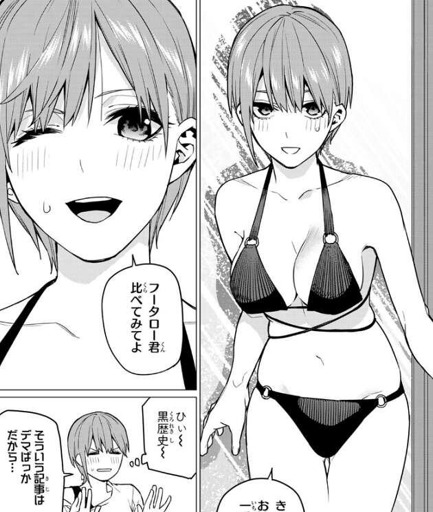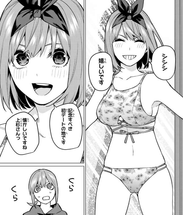 二乃は一花の、抜群のプロポーションはまだまだ成長中だと言い、一花の水着ではないかと言い出します。一花も風太郎と一緒に水着の試着に来ていたようで、その時の事を思い出します。
