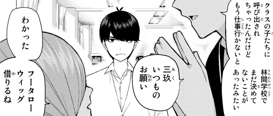 その後一花は三玖に「いつものお願い」をして、三玖は「わかった」といってウィッグをかぶります。