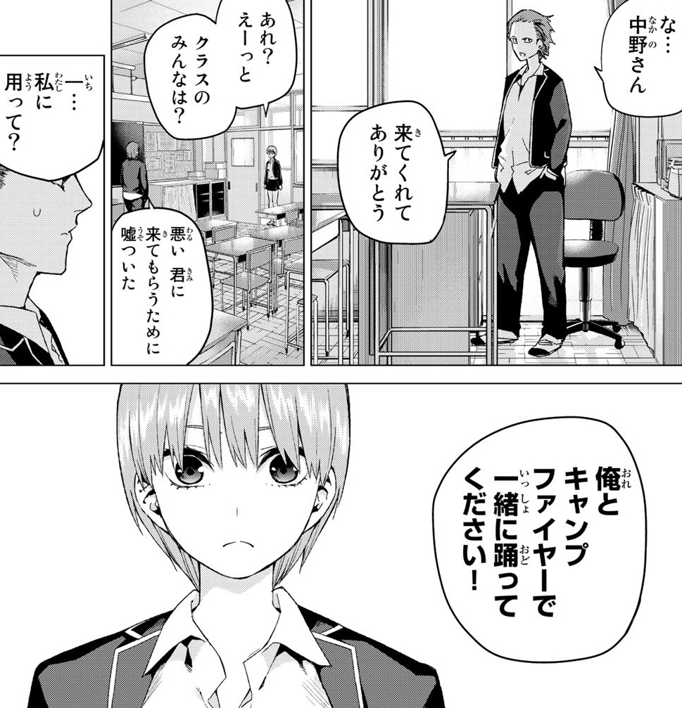 返事くらい待ってやれよ!と男子生徒を説得しますが、三玖からは「フータローが言うと説得力がない…」と逆に呆れられます。言い合いが続くなか三玖は「この人と踊る約束してるから」ととんでもない提案をします。
