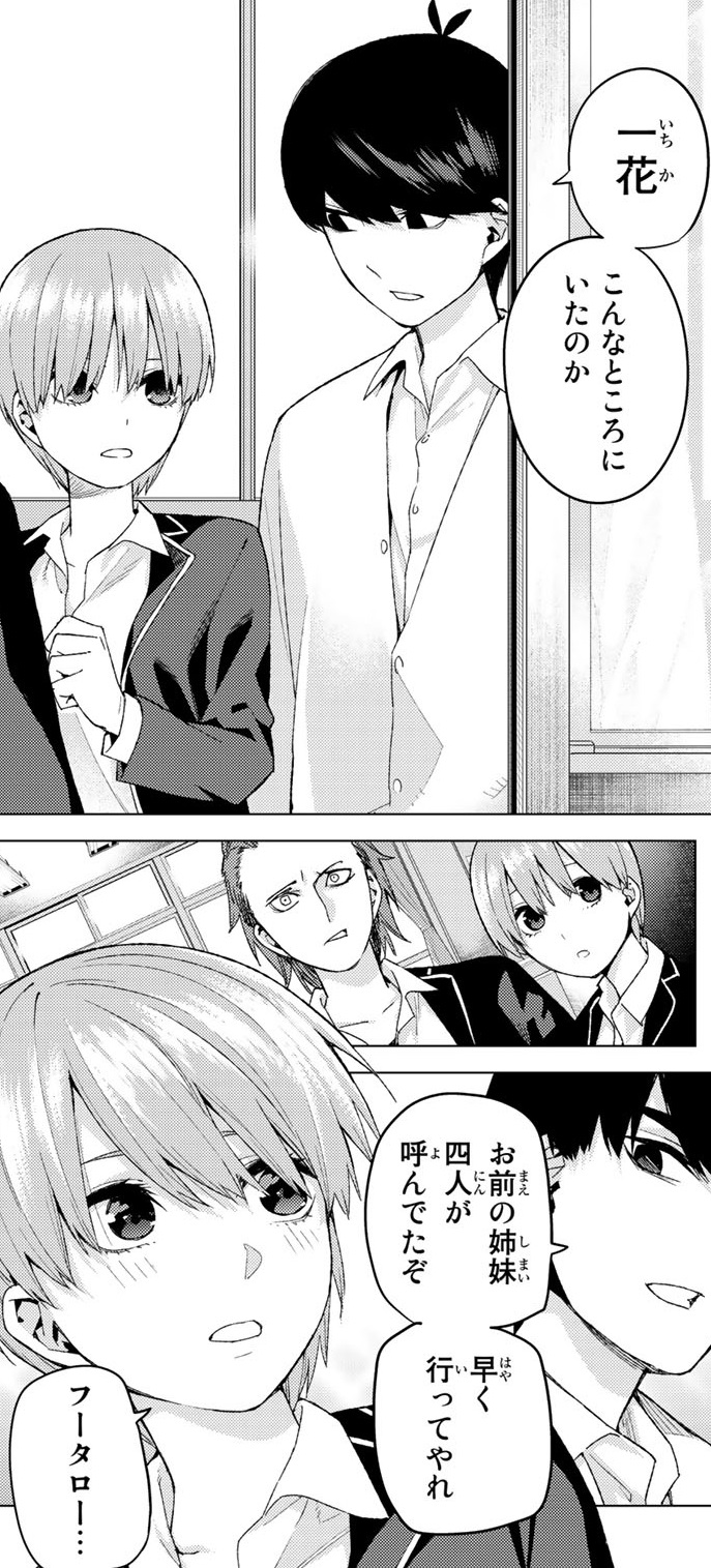 ここで風太郎は「自業自得だな」と思いつつも三玖に助け船を出し、この場を収めようとします。「お前の姉妹4人が呼んでたぞ」「早く行ってやれ」。