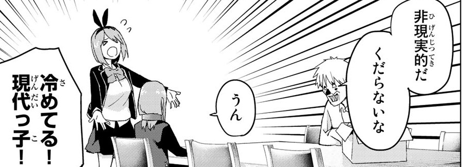 しかし風太郎と三玖は非現実的だと一蹴します。「冷めてる!現代っ子!」