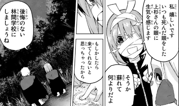風太郎と四葉で驚かせている所に、一花と三玖のペアが来ます。そしてこの後、三玖が意味ありげに一花に問いかけます。一花どう返すのですかね?キャンプファイアーのダンスでひと波乱ありそうです。