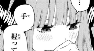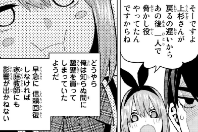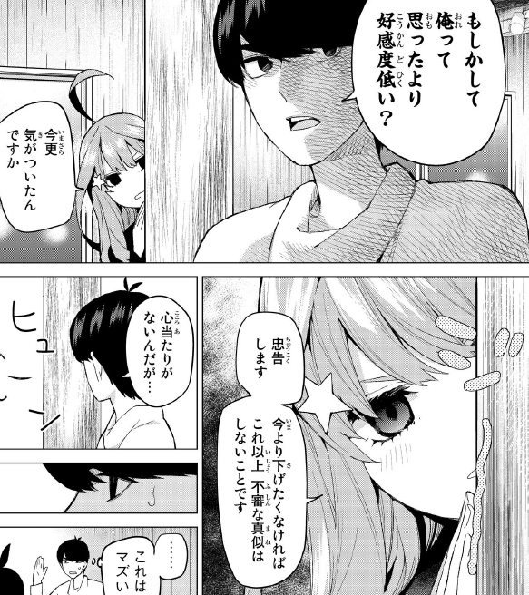 二乃に話をつけようと手をつかんだら三玖でした。その三玖にも冷たくされて、風太郎は今さらに好感度低いことに気づきます。五月からも鋭い指摘が。早急に手をうたなくては。