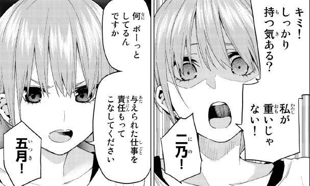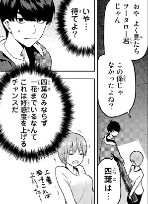 好感度を上げようと変な喋り方をして逆に不審がられます。結局事情を話したところ、一花が練習相手になってくれます。姉妹になりきる一花ですが、、、さすが五つ子、そっくりです。