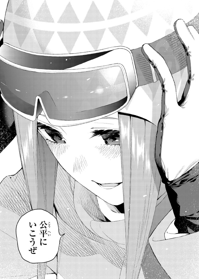体調はまだ万全ではありませんが大丈夫なようです。五月は顔を合わせづらいとの事で一人滑っているようです。ここで風太郎と一花、三玖、四葉でスキーの追いかけっこです。まだまだ風太郎には無茶ですが、三玖と話せるチャンスです。が、一人先に進みます。
