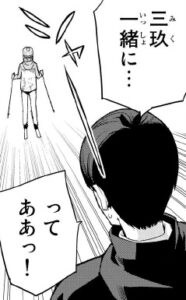全員平等もいいけどその努力は否定してはいけない、公平に行こうと言います。ここで三玖は一花に「平等に」と言って、キャンプファイヤーのダンスの相手を譲ったことを思い出し自分も公平に行こうと考えます。
