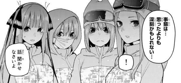 今回の話は三玖の悩みが晴れる二時間前の話です。一花を看病している五月ですが、旅館や倉庫で見た風太郎の怪しい行動に、五月はずっと警戒しているようです。