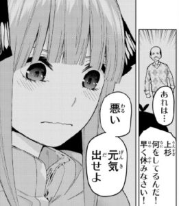 風太郎経由で金太郎と会えない形になりました。体調の悪い風太郎はそんな中でも二乃に気を使います。