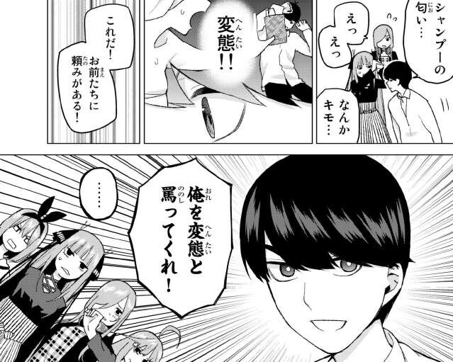 しかし風太郎には同じ顔に見えてしまいます。そこでシャンプーの匂いで区別しようとしますが、完全に変態です。みんな風太郎にドン引きしています。
