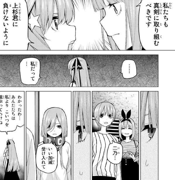 あの後、二乃と五月の喧嘩がエスカレートします。五月は風太郎が作った問題集を粗末に扱った事を、風太郎に謝る事を要求します。三玖は風太郎が作った問題集は全て手書きで、五つ子全員真剣に取り組むべきだと言います。