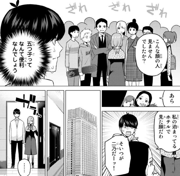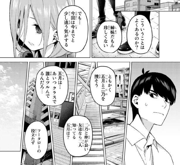 結局二乃にホテルのフロントに通報されてしまい、一旦撤退します。二乃の居場所は分かり無事ホテルにいる事も判明したので、次は五月です。しかし五月は家に財布を忘れていて一文無しの状態です。腹を空かせているだろうなと、心配する風太郎です。