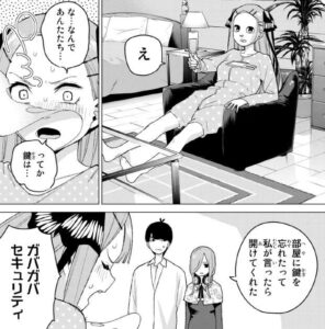 部屋に入る方法はやはり三玖が自分自身で言って、開けてもらっています。これには二乃も「ガバガバセキュリティ」と怒ります。