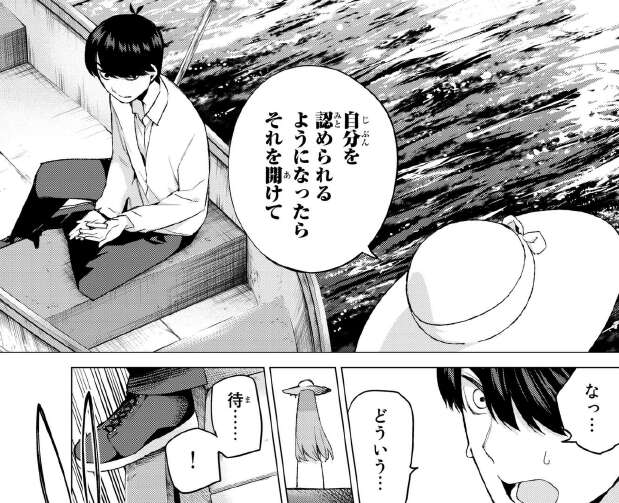 そのお守りを渡した後、自分を認められるようなったらそれを開けるように言います。風太郎はどういう意味か問いただそうとしますが、池に落ちてしまいそのまま零奈を見失ってしまいます。