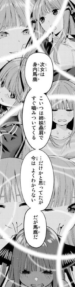 零奈にもう会えないと去られて、四葉は試験勉強に連れ戻せず茫然自失状態の風太郎に救いの手を差し伸べたのは、やはりというかツンデレの二乃です。しかし零奈が五つ子の誰かだとしても、今回の話の流れ上二乃の線はかなり薄い気がしますが、今後どうなるか気になります。