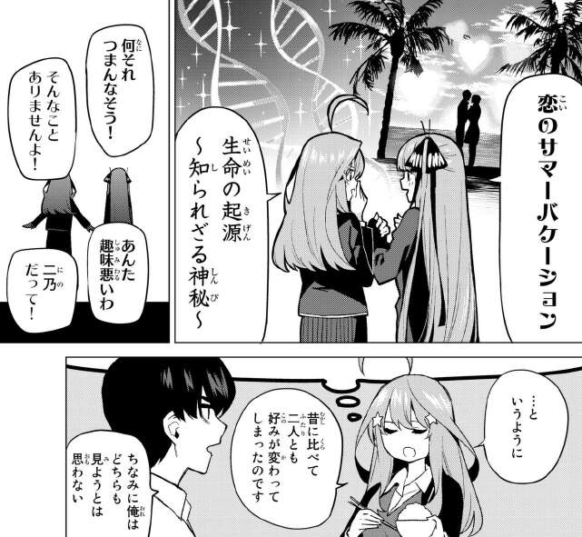 二乃は「恋のサマーバケーション」がおもしろそうだったと言っています。恋バナが好きな二乃らしいです。五月は「生命の起源~知られざる神秘~」で、サイエンス映画っぽいです。真面目な五月らしいです。