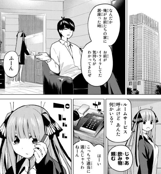 結局五月を説得できませんが、五月はいつの間にか風太郎の父親と妹にすっかり打ち解けていてまるで自分の家のように振る舞っています。二乃の部屋に戻ってから、二乃にお前がイライラした気持ちがわかってきたと話します。しかしルームサービスは適当にと、飲み物を頼むやりとりは、まるで夫婦のようです。