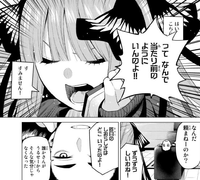 せっかく素直に二乃が謝罪したので(五月でなく風太郎にですが)、五月にも謝罪をさせようとしますが、五月は二乃がすんなり謝罪したことが信じられません。