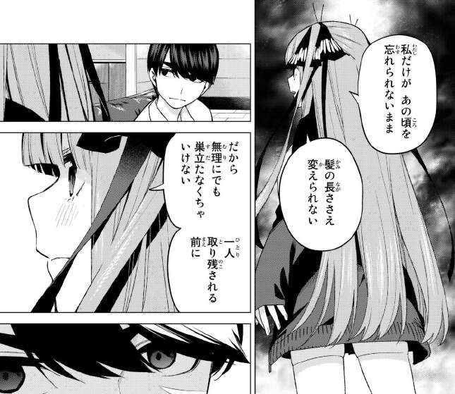 二乃の髪型や考え方は五年前の出来事が深く関わっているようです。その出来事をかなり引きずっているようです。風太郎も「これが俺の掬い取れなかった姉妹を大切にするが故の二乃の心理…」と理解しているようです。