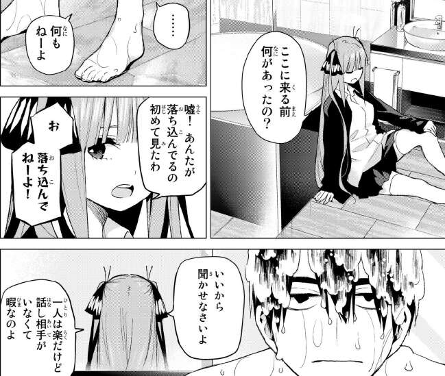 シャワーを浴びている間、髪型の話になります。風太郎の髪はらいはがカットしていて、あの髪型なのは、らいはがあの形にしかカットできないからです。倹約家の風太郎らしい理由です。いつの間にかスムーズに二乃と風太郎は会話が出来ていますが、二乃は風太郎に落ち込んでいる理由を聞きます。風太郎は何もないと強がりますが、二乃はすぐに嘘だと見抜きます。