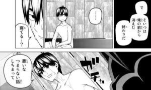 呆れる二乃ですが、風太郎の体の匂いが臭い事に気付きます。風太郎は池に落ちたと事情を説明しますが、匂いに関しては全然に気にしていません。強引にシャワーを浴びさせる二乃です。