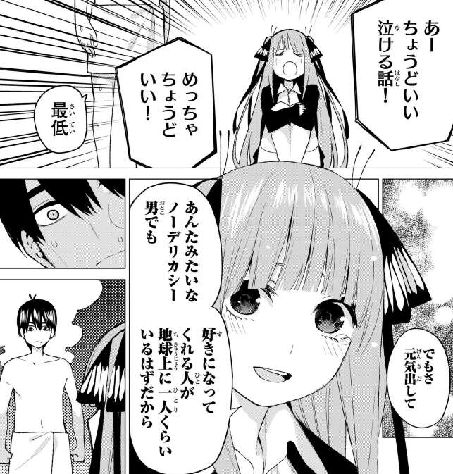 風太郎の為に泣いてくれたのかと思っていたら、単純にいい話だったから泣いただけのようです。「めっちゃちょうどいい」という発言に、風太郎ですら思わず「最低」と抗議します。続くセリフも風太郎を元気づけているように見えて、結構ひどいです。