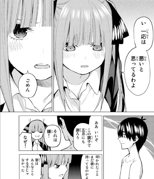 悪いと思っていると素直に謝る二乃です。風太郎はこの調子で五月にも謝り、仲直りしようと言いますが叩かれた事をまだ根に持っています。五月が変わってしまい、知らない子になってしまったようだとショックを受けています。