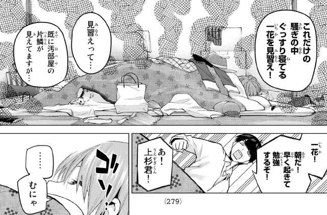 一花の寝どころが、既に汚部屋と化しているように見えます。風太郎が起きるように一花を注意します。
