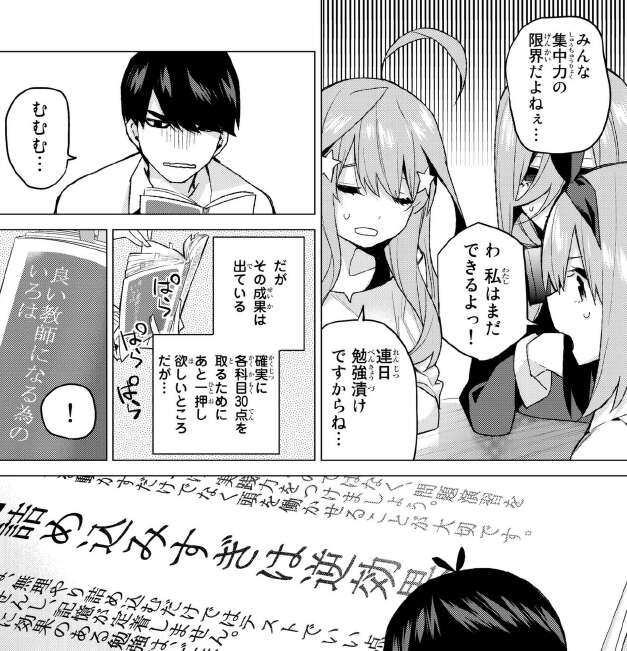 五つ子たちに勉強を教えるのに苦労していた風太郎ですが、やっと香料が見えてきたと言って、四葉に他の姉妹に国語を自分と一緒に教えてやってほしいと言います。