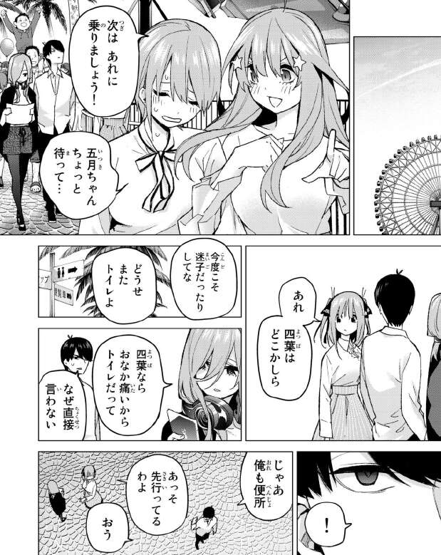 というわけで、遊園地で風太郎と五つ子全員は、久しぶりに遊びまわります。が、途中四葉がトイレと言って、皆と別行動をします。何か感じた風太郎は四葉を探しに行きます。