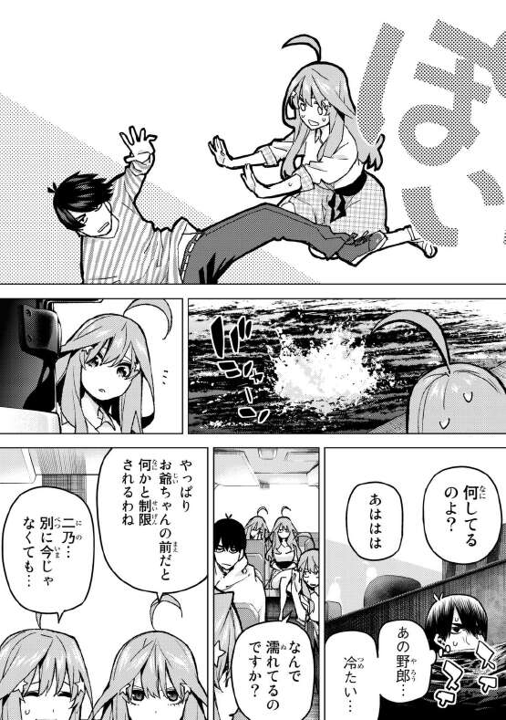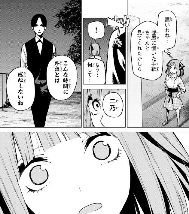 が、結局二乃が近づいてきて風太郎は海に落とす事で、二乃を風太郎から隠します。結局二乃は、夜に抜け出して風太郎の所に会いに行くと言い、一花に手伝ってほしいと言います。五つ子のお父さんがネックなので、もし五つ子のお父さんが来そうになったら足止めして欲しいと言います。