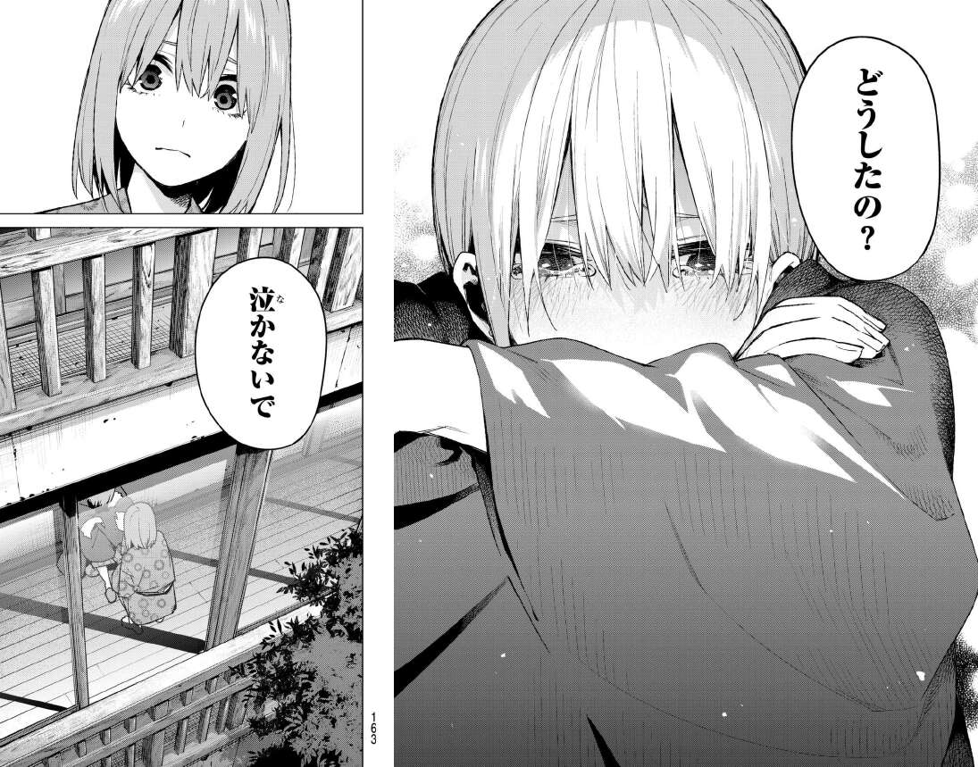 一花は二乃が本気で恋をしていると分かり、もう一花の入る余地も、資格もないと落ち込みます。夜にトイレの前で落ち込んで泣いているところを、トイレに行こうとする四葉に見つかります。一旦は何も見なかった事にしてスルーしようとする四葉ですが、戻ってきて一花を慰めます。