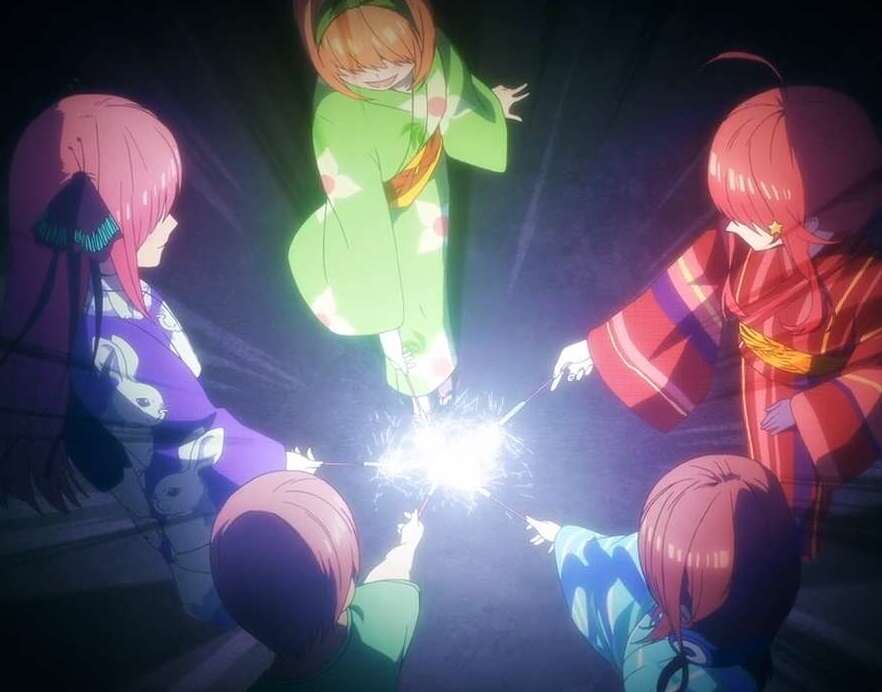 TVアニメ4話は花火大会編の前半といった感じです。らいはのお願いで風太郎とらいはと五月がゲームセンターデートをした帰り、浴衣姿の一花たちと偶然出会います。その後、風太郎が五つ子全員と花火を見るために、奔走しています。