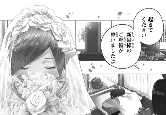 ネタバレですが、最初は風太郎と花嫁(5姉妹の誰かでしょう)が結婚式の準備が整って、これからという所で階層に入るところから始まります。