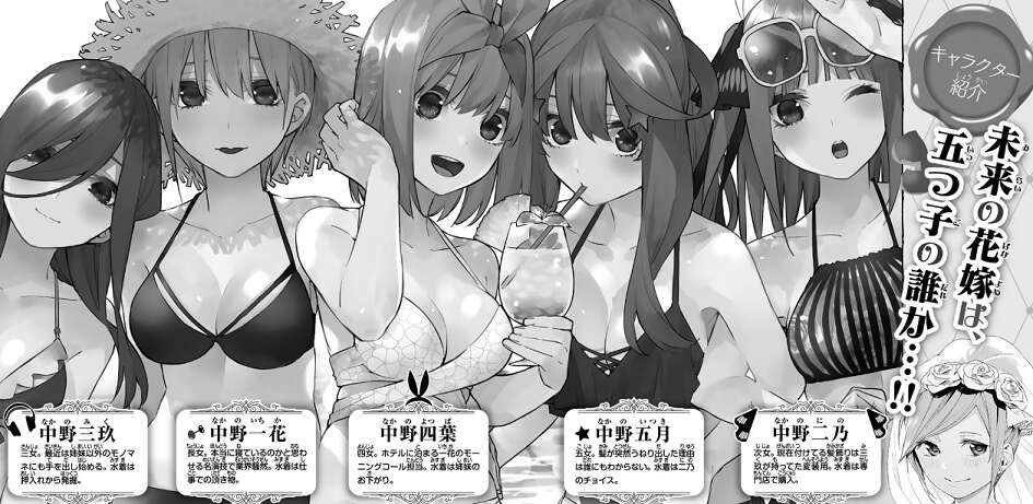 今回のキャラクター紹介では、五つ子たちが着ている水着について書かれています。