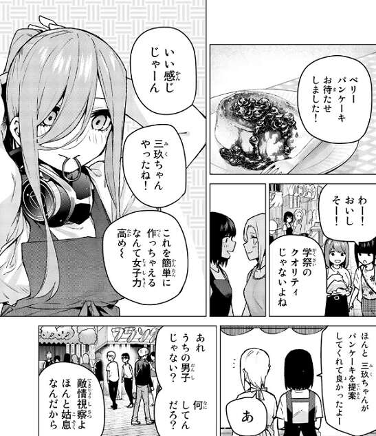 今回は学園祭 後夜祭が終わり、全てのスケジュールが終了したアナウンスを聞いている三玖の描写から始まります。その後は時間が巻き戻り、三玖が夜遅くパンケーキを作る練習をしている場面です。努力のかいもあって学園祭当日は、パンケーキは学際のクオリティじゃないよね、と好評です。ただクラス男子のたこ焼き組とは未だに仲が悪く、三玖は何とかクラスの男子と女子が仲良くできないかと悩みます。