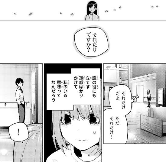 前回、五つ子たち全員が学園祭の全てが終わる頃各々の部屋で、風太郎を待つことにしましたが、風太郎は前田、武田と一緒に池の前でクラスの誰かが他のクラスの子と付き合いだした、というような話をしています。そんな話をしながら学園祭が終わってしまう寂しさを感じていると、せっかくだからいつまでもこんなところに座っていないで屋台に食いに行こうと前田が言います。風太郎も行けずじまいの店があったと賛成し、その後は会う約束をしている奴がいると話します。