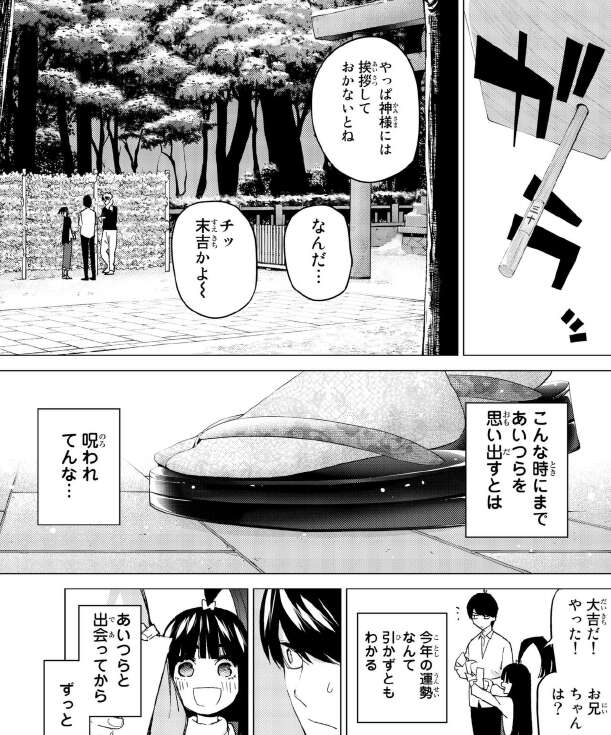 お正月を迎えた風太郎は家でらいはとテレビを見てくつろいでいます。テレビからはテレビドラマがながれていますが、風太郎にとっては誰が好きかよりは世の中お金のようです。お正月の挨拶を終えた風太郎は帰ろうとしますが、らいはからもう一か所、ご挨拶が終わっていないと言われ、渋々らいはに付き合いますがそこで五つ子たちと出会います。
