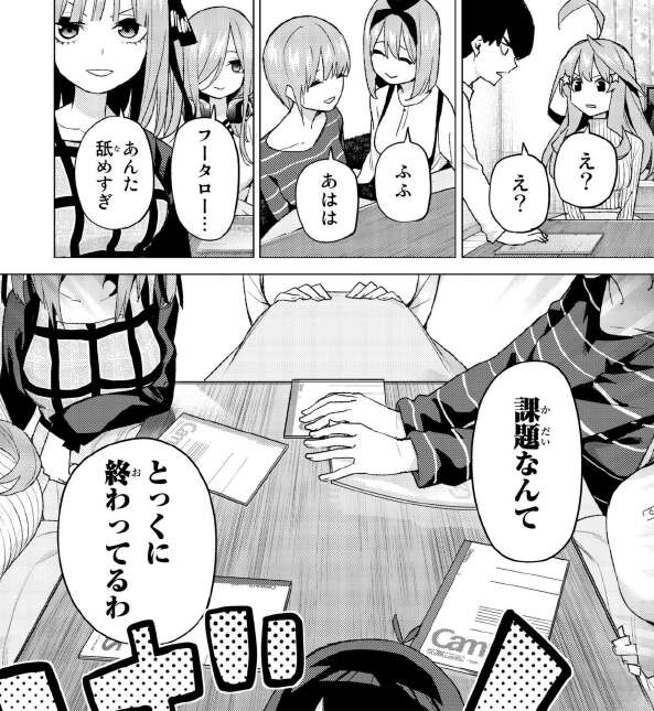 新しい家で新生活をおくる五つ子たちですが、新生活のストレスからなかなか寝られずケンカをしています。風太郎は五つ子たちに早速、冬休みの課題を始めようと言いますがやる気になっている五つ子たちは既に冬休みの課題を終えていて、やる気満々です。