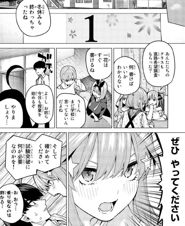 お正月が終わりいよいよ、試験が始まりました。この試験で赤点をとってしまうと別の高校に転校させられてしまう為、全員やる気満々です。そして試験を迎えて、五つ子たち各々の思惑も絡んでいて、試験が終わった後は二乃が衝撃の行動を起こします。