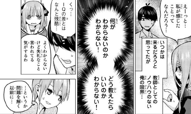 期末試験は無事終わり、全員赤点回避を出来ましたが二乃だけが期末試験後、どこかに行ってしまい風太郎は二乃を探しに出かけます。場面変わって、二乃は状況を報告すべく中野パパに直接会って話をします。今後も五つ子たち全員で頑張る事を伝えますが、中野パパに反対されますが、そこに風太郎が現れます。
